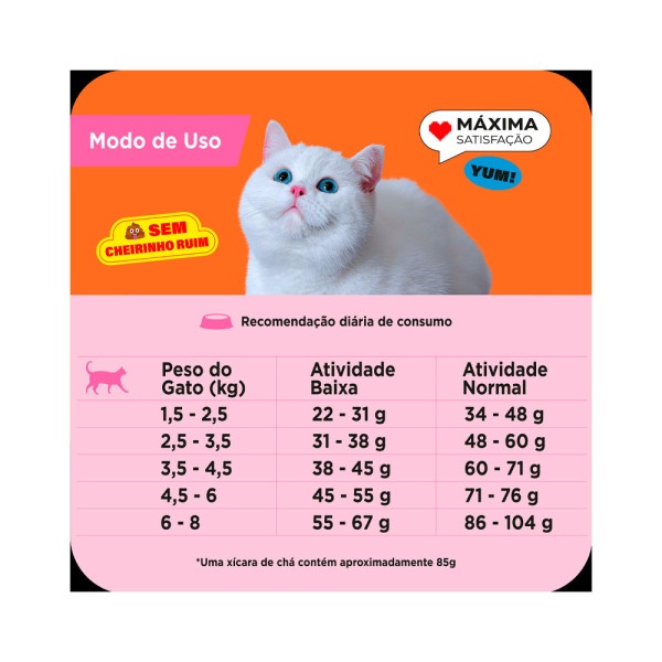 1. Consulte a sugestão de quantidade diária ideal para seu pet no verso das nossas embalagens. As porções podem variar de acordo com a idade, atividade e temperamento do seu gato.