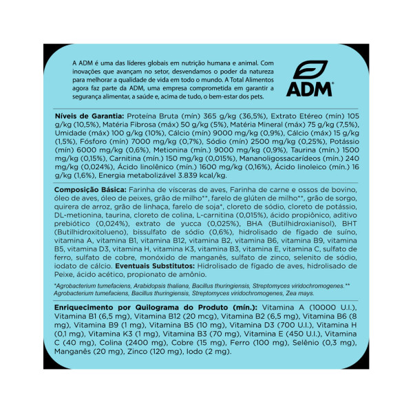 Proteína Bruta (mín) 365 g/kg (36,5%), Extrato Etéreo (mín) 105 g/kg (10,5%), Matéria Fibrosa (máx) 50 g/kg (5%), Matéria Mineral (máx) 75 g/kg (7,5%), Umidade (máx) 100 g/kg (10%), Cálcio (mín) 9000 mg/kg (0,9%), Cálcio (máx) 15 g/kg (1,5%), Fósforo (mín) 7000 mg/kg (0,7%), Sódio (mín) 2500 mg/kg (0,25%), Potássio (mín) 6000 mg/kg (0,6%), Metionina (mín.) 9000 mg/kg (0,9%), Taurina (mín.) 1500 mg/kg (0,15%), Carnitina (mín.) 150 mg/kg (0,015%), Mananoligossacarídeos (mín.) 240 mg/kg (0,024%), Ácido linolênico (mín.) 1600 mg/kg (0,16%), Ácido linoleico (mín.) 16 g/kg (1,6%), Energia metabolizável 3.839 kcal/kg.