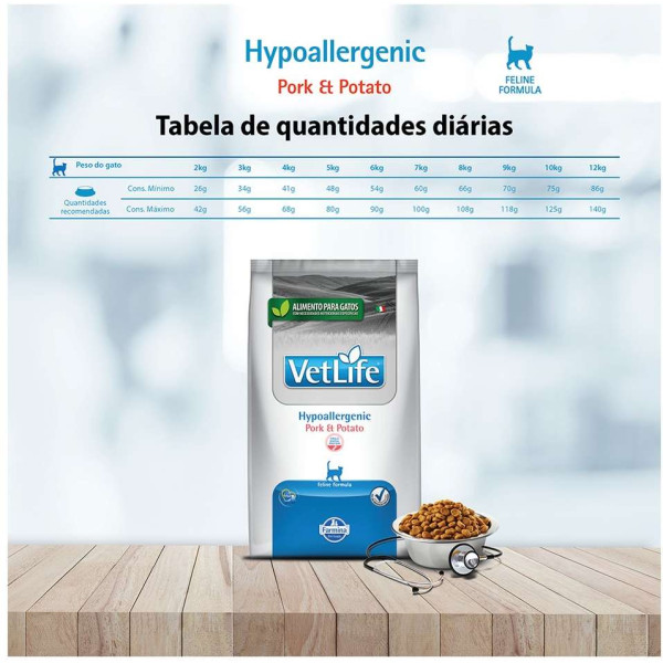 A Ração Seca Farmina Vet Life Natural Hypoallergenic Pork e Potato para Gatos Adultos é um alimento coadjuvante cuidadosamente desenvolvido para auxiliar na recuperação e bem-estar dos felinos adultos que enfrentam alergias ou intolerância a nutrientes. Muitas vezes, essas reações adversas estão relacionadas à sensibilidade a determinadas proteínas e resíduos presentes na dieta. Para atender às necessidades específicas desses pets, esta ração possui uma fórmula especial que visa minimizar a presença dos fatores frequentemente responsáveis por reações alérgicas e intolerâncias.