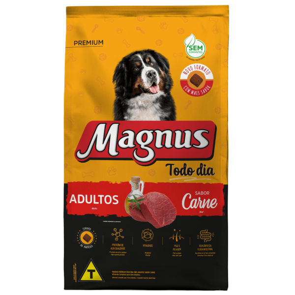 Magnus Premium Todo Dia Cães Adultos Sabor Carne é um alimento premium completo seco, formulado com precisão para atender as exigências do cão adulto, acima de 12 meses, de qualquer raça, em fase de manutenção. Nutritivo e saboroso, agrada ao paladar do cão, provendo benefícios a sua vida. Sem Corantes Artificiais