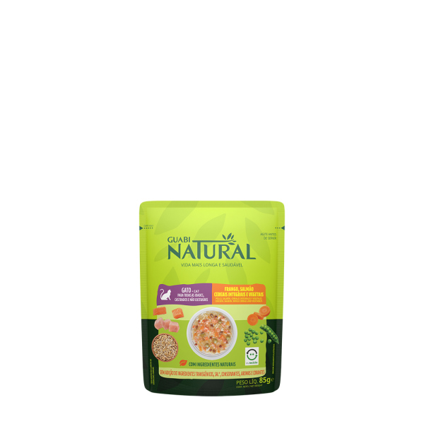 Ração Úmida Sachê Guabi Natural Para Gatos Castrados Sabor Frango, Salmão e Cereais 85G