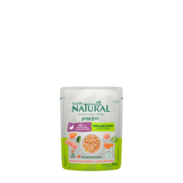 Ração Úmida Sachê Guabi Natural Grain Free Para Gatos Castrados Sabor Frango e Salmão 85G