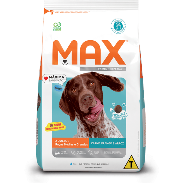 Com Max Cães Adultos Raças Médias e Grandes Carne, Frango e Arroz é fácil cuidar do seu filho de quatro patas, para ele viver saudável e feliz. Cuidadosamente elaborado com um mix de proteínas, garantido que seu peludo deixe o prato limpinho. Enriquecido com vitaminas e minerais, além de auxiliar no combate ao acúmulo de tártaro. Com Max, o cuidado do seu peludo está em ótimas mãos.